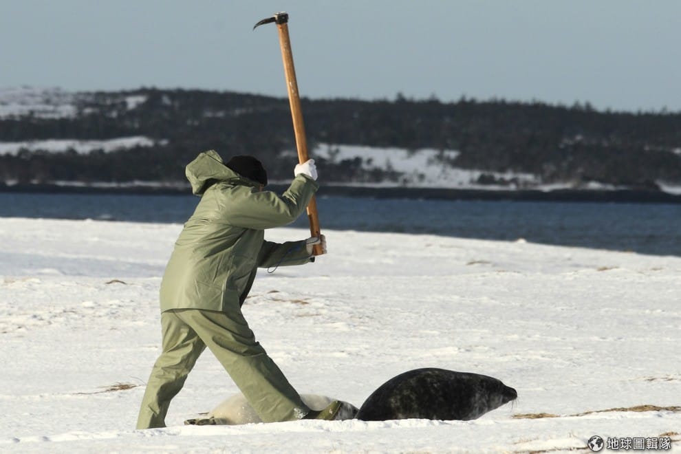 圖拍攝於 2011年的加拿大,海豹獵人拿起工具準備敲死海豹。活活敲死海豹的狩獵手段也常成為動保團體抵制狩獵海豹的原因之一。