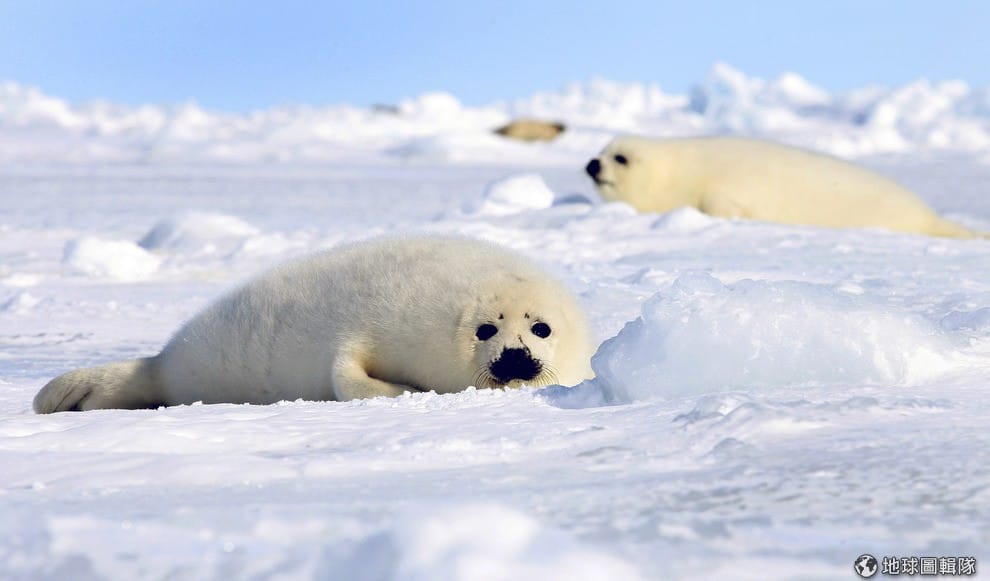 圖拍攝於 2009年,一隻隻豎琴海豹趴在大浮冰上頭。