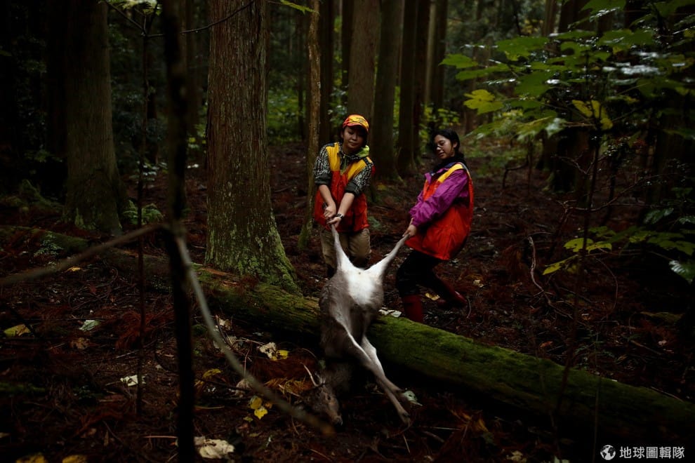 「看看血跡。」兒玉千明一邊在福井縣的深山裡觀察著地上有沒有公鹿的血跡,一邊傳授獵鹿的技巧給一旁的福野葵。
