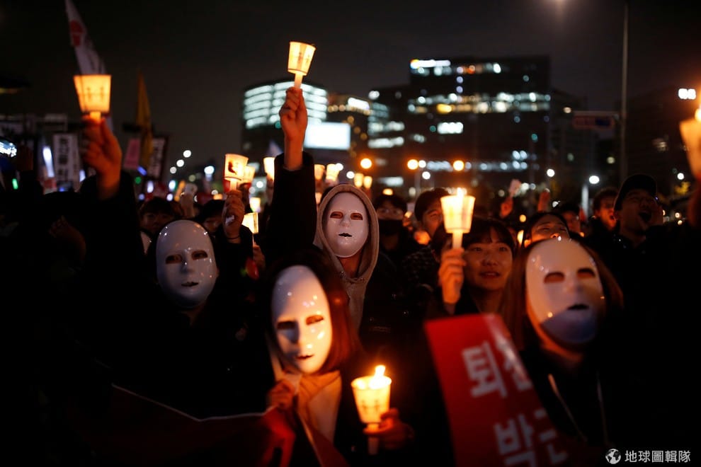 圖為 2016年11月,民眾帶著白色面具聚集在南韓總統府青瓦台前方,要求讓南韓總統朴槿惠下台的畫面。目前負責朴槿惠貪汙案的南韓獨立檢察組懷疑,南韓公平交易委員會(Korea Fair Trade Commission, KFTC)和南韓金融服務委員會(Financial Services Commission, FSC)可能也有牽涉其中。