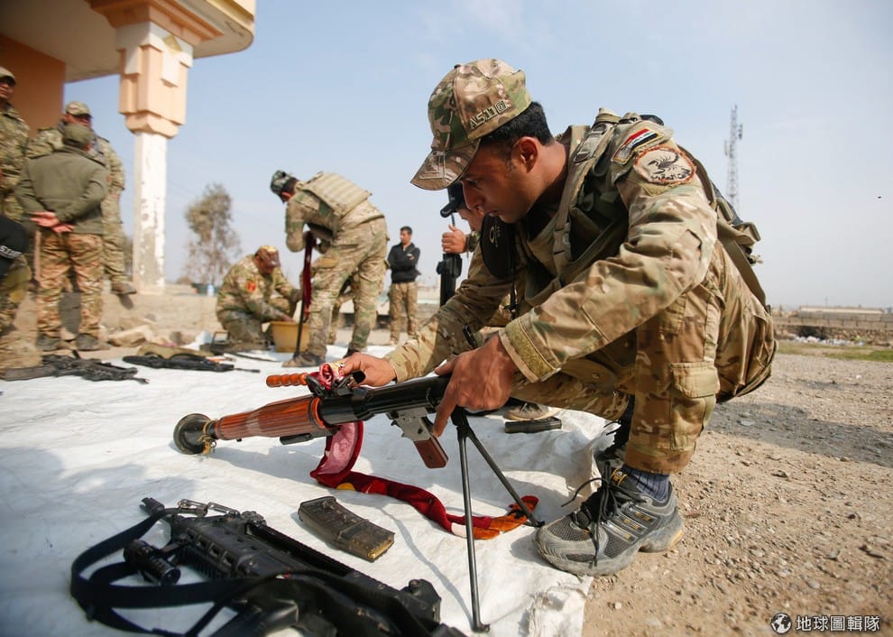一名伊拉克政府軍軍人正在清理使用過的武器。