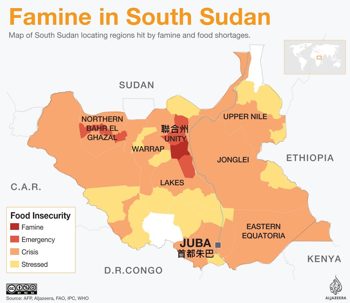 在《半島電台》製作的南蘇丹飢荒地圖中,顏色越紅的地方代表飢荒情況越嚴重。位於南蘇丹北方的聯合州已正式被聯合國宣布陷入飢荒。