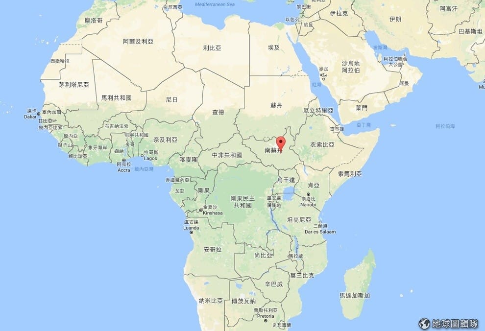 圖中紅色地標就是南蘇丹,該國在 2011年時從蘇丹獨立出來,是目前世界上最年輕的國家。