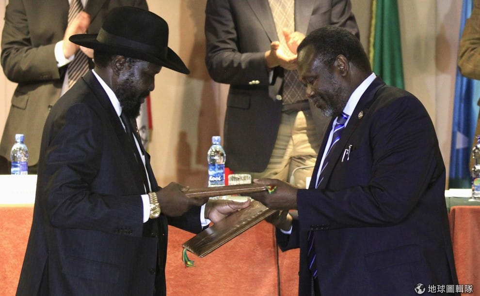 2015年,南蘇丹總統基爾(左)與反政府軍領袖馬查爾(右)簽訂和平協議,結束了為期兩年的內戰。