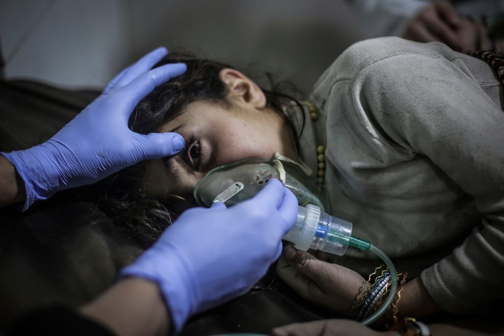 一名敘利亞孩童孩正在大口狂吸氧氣,他剛剛遭到氯氣彈的攻擊。氯氣桶裝炸彈製作便宜、容易運送,在散播恐懼上有奇效,可說是「窮人的化武」。