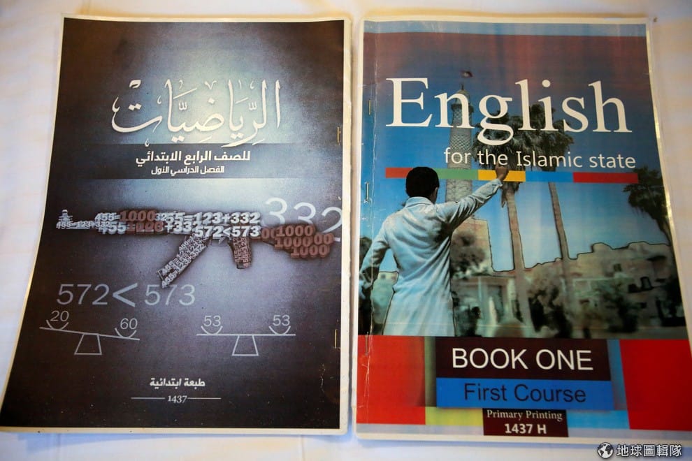 圖為伊拉克聯軍在摩蘇爾城內,找到伊斯蘭國用來培養兒童聖戰士的數學和英文課本。