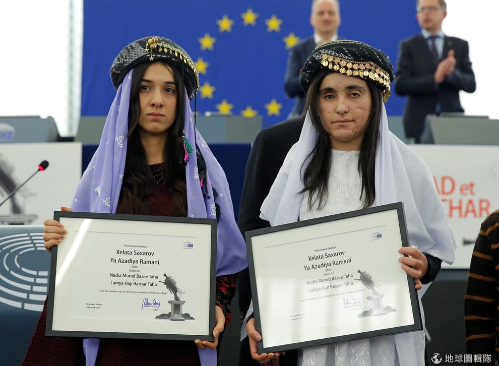 圖為來自伊拉克的亞茲迪(Yazidi)少女塔哈(Nadia Murad Basee Taha)和巴夏爾(Lamiya Aji Bashar),她們在去年 12月獲得了捍衛人權和思想自由的沙卡洛夫獎(Sakharov Prize)。逃離伊斯蘭國迫害的她們,現在也以人權鬥士的身份分享過去遭到虐待的種種經歷。