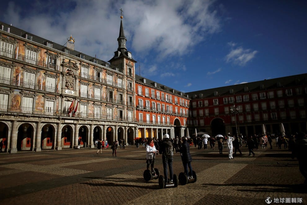 路透社照片拍到人們駕駛著賽格威到馬德里(Madrid)主廣場(Plaza Mayor)觀光,省時省力的賽格威現在也成為許多觀光客的代步首選。