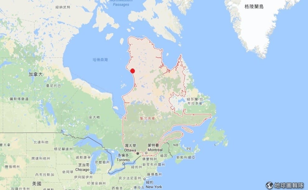 圖中紅點處就是研究團隊採集古老岩石的地點,位於加拿大魁北克省境內。