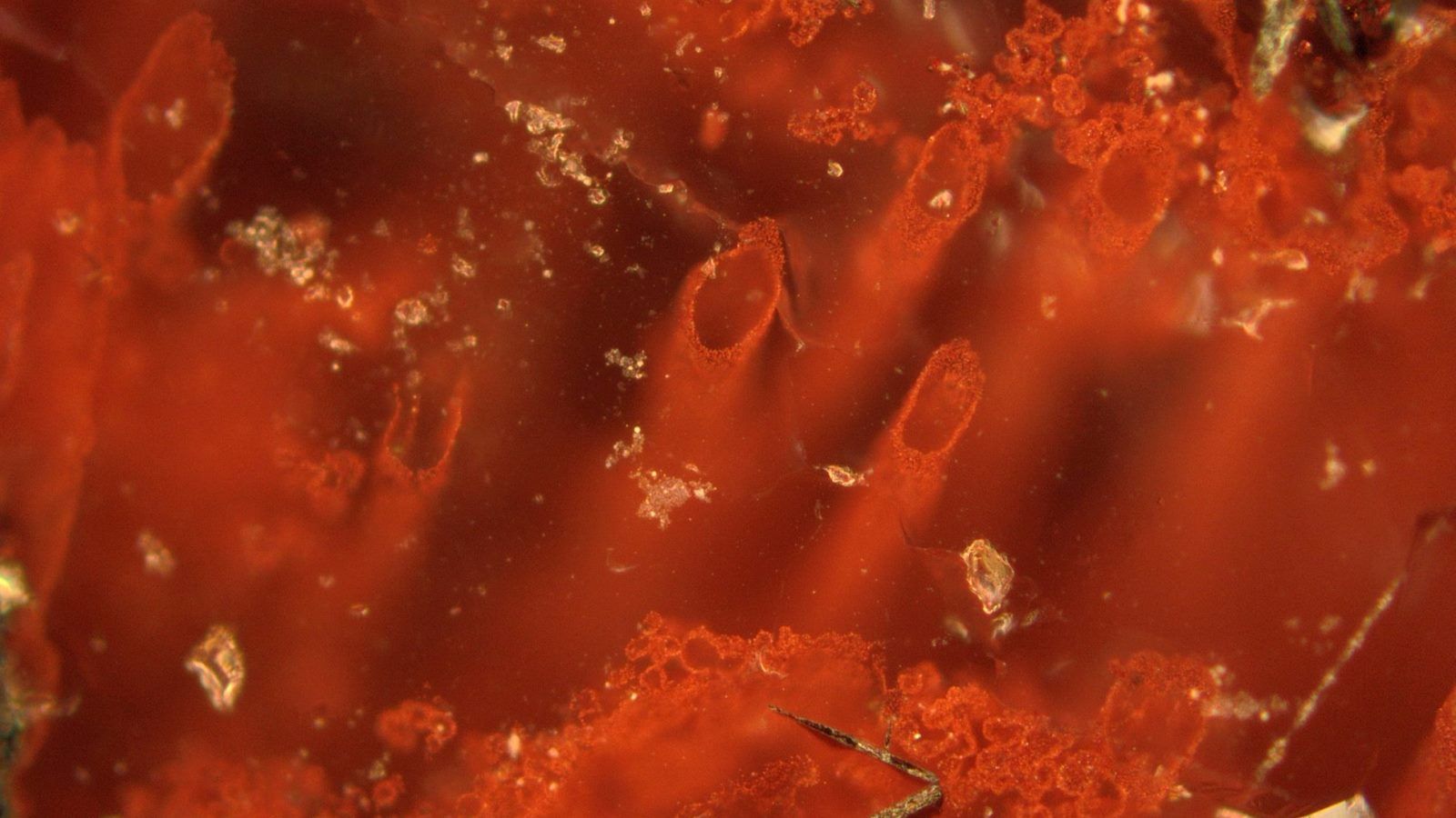 採集樣本經過專業顯微鏡放大後發現,赤紅色長絲狀的微化石構造和現今的細菌很像。
