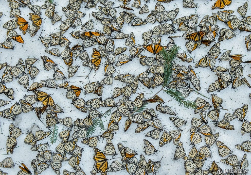 羅薩里奧帝王蝶生物圈保護區的雪地上,躺著成群帝王蝶所構成的美麗圖像。墨西哥中部山區在 2016年3月8日到 9日發生暴風雪,攝影師羅霍在同月 12號,抵達保護區拍下了這幅畫面。