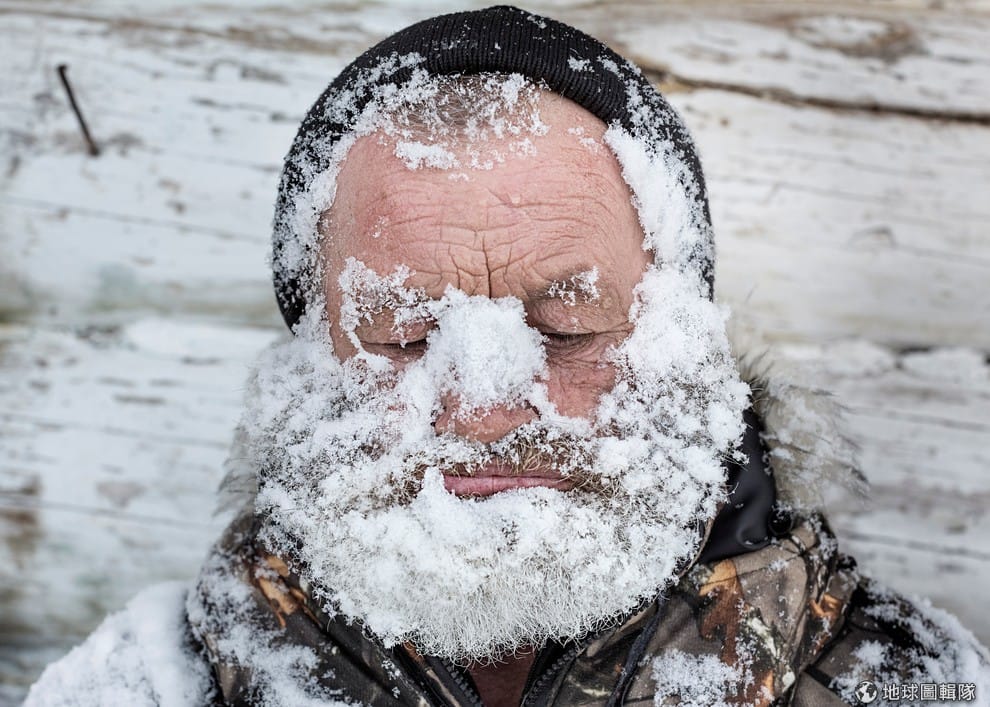 一名獵人用冰雪把臉洗乾淨。這裡是俄國北部,靠近下通古斯河(Nizhnyaya Tunguska River)的小聚落,大約有 100人居住於此,打獵和毛皮交易是他們最主要的謀生工具。