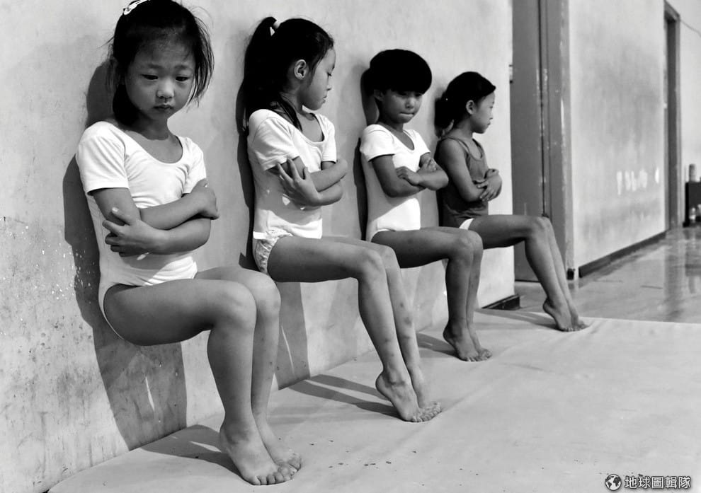 中國體操學校的學生正在進行 30分鐘的趾壓訓練。
