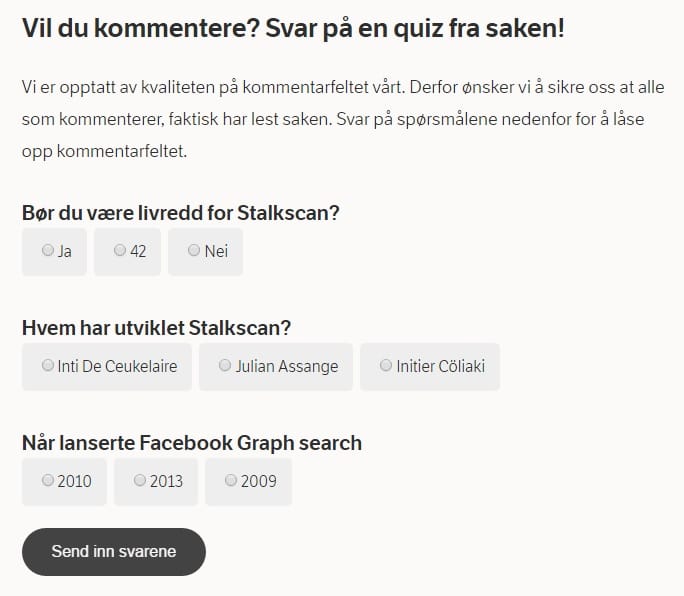 NRKbeta表示,從今年 2月中旬開始,網友要在每篇文章的留言區留言前,都得回答與該篇文章相關的 3個問題,回答完後文章留言區才會開放,這麼做是為了避免有的讀者不了解文章討論的主題就隨意發言。