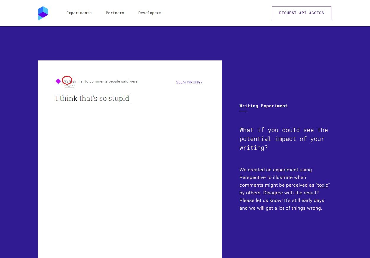 在字母集團開發的Perspective判讀惡意留言應用程式上,「我覺得那很笨」這句話惡意程度高達 92%。