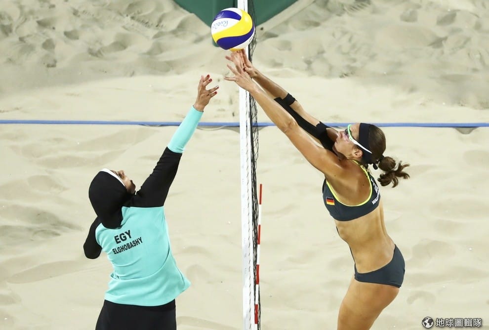 圖為 2016年里約奧運上,身披頭巾的埃及排球員艾朵巴(Doaa Elghobashy)與穿著比基尼的德國排球員比賽的畫面。現在奧運已經允許女性在比賽時也可以穿長袖長褲。