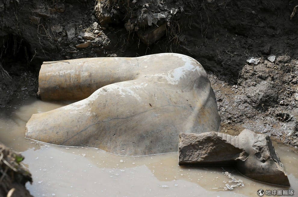 圖為考古團隊在泥水坑找到的雕像殘骸。這次考古一共發現了兩尊雕像,兩座雕像的身份應該是拉美西斯二世和賽提二世。