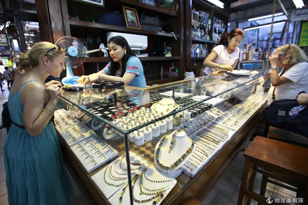 觀光客正在仰光(Yangon)的店面內挑選加工過的玉造飾品。