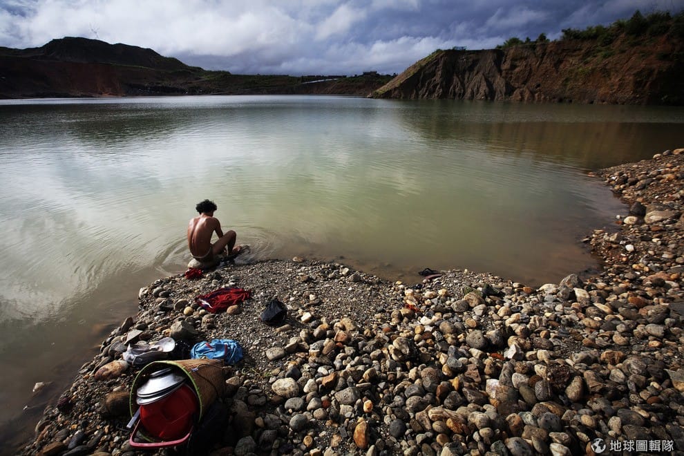 一名工人在玉石礦結束開採後,坐在湖岸旁洗淨身體。