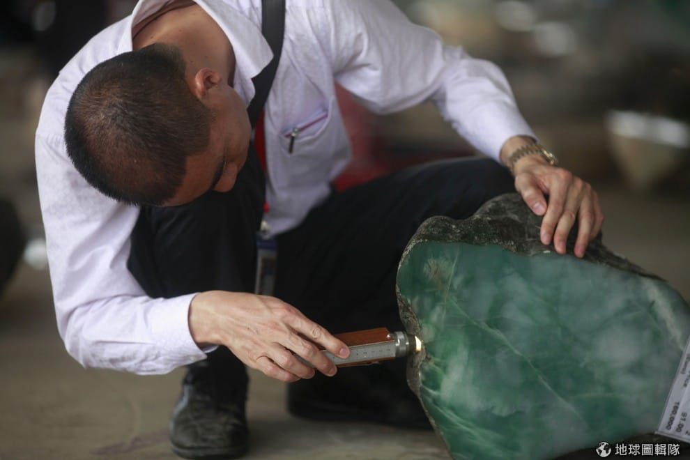 另一個緬甸玉商,遞給我手電筒和一塊不起眼的「半明料」,是已經切開部分,或像開個小窗確認玉質,但還保有石質的玉石。至於尚未切割者,則稱為「毛料」,是「賭石」的對象。買家或玩玉人秤斤論價買進「石頭」,就賭著,切下去是 6 萬變 600 萬的極品美玉,還是一文不值的石頭。