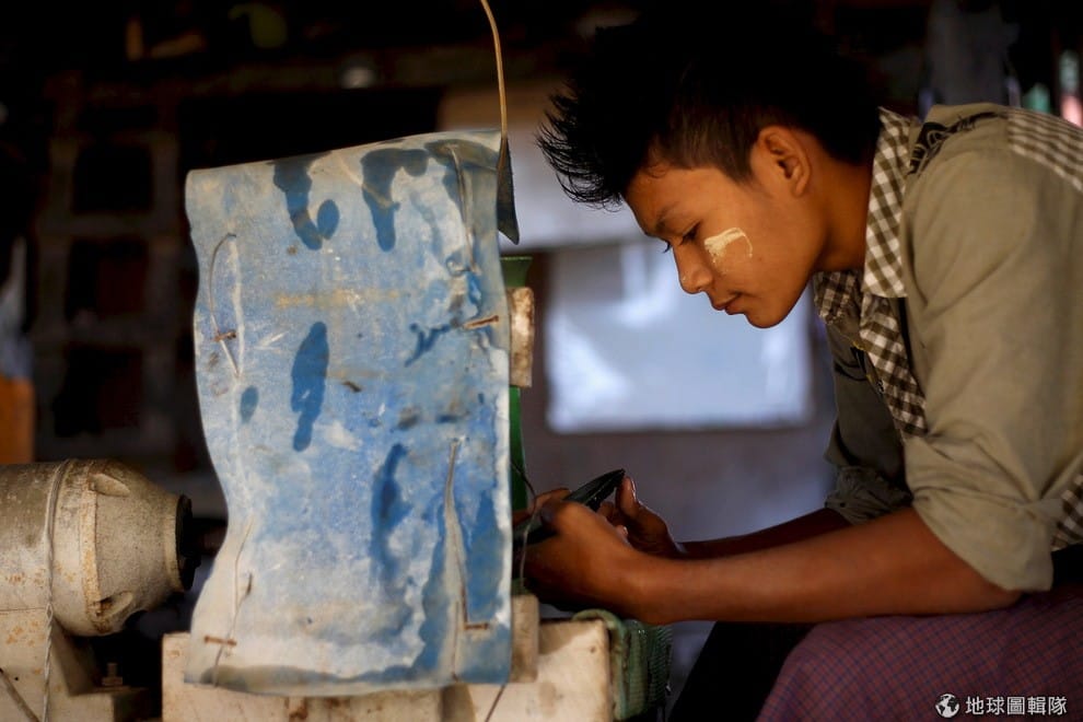 在一家緬甸的玉店,一名男子正在仔細打磨手上的玉石。