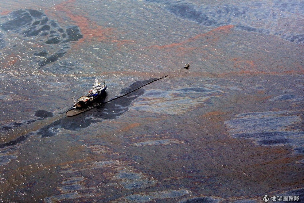 圖拍攝於 2010年6月,一艘工船在覆滿石油的海面上航行著。2010年 4月,英國石油公司在墨西哥灣鑽油時發生爆炸,造成大量原油蔓延到海面導致嚴重的生態浩劫。這類石油汙染也會使得一些微生物難以生存。