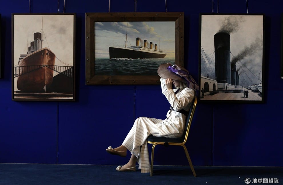 一名工作人員打扮成《鐵達尼號》電影中女主角的模樣,坐在鐵達尼號紀念館裡。