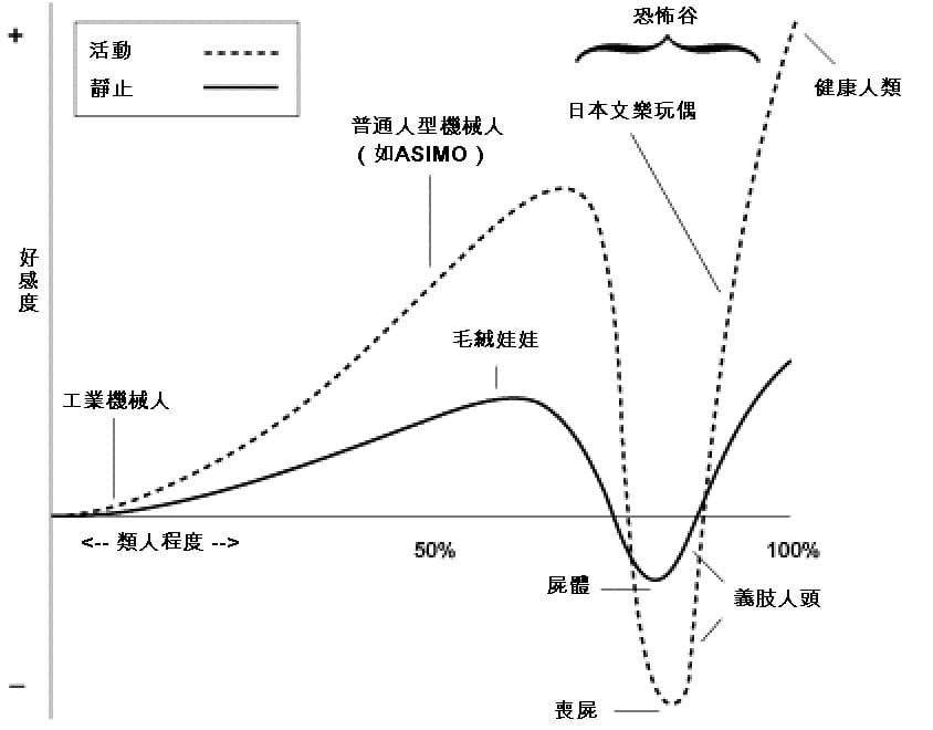 圖即為恐怖谷的情緒示意圖。根據《維基百科》,恐怖谷就是隨著機器人到達「接近人類」的相似度時,人類好感度突然下降至反感的範圍,然而,當機器人和人類的相似度繼續上升,相當於普通人之間的相似度的時候,人類對他們的情感反應會再度回到正面,產生人類與人類之間的移情作用。在網路上也有影片以實際範例展現恐怖谷的狀況。