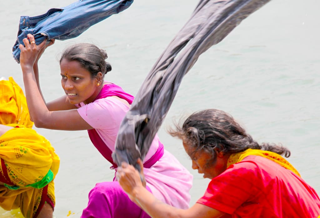 圖為在岸邊洗衣的印度女子。目前印度大部分家庭還是用手洗衣物。