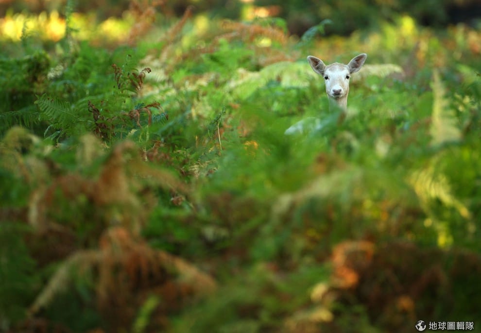 攝影師碰見了一隻特別斑紋的小鹿,白色的小鹿在茂密的蕨類中探頭。圖片來源:Christopher Furlong/Getty Images
