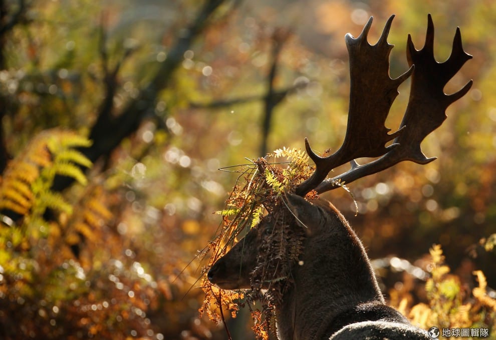 覓食中的成鹿,頭上滿是散落的枯枝落葉,好像在偽裝一樣。圖片來源:Christopher Furlong/Getty Images