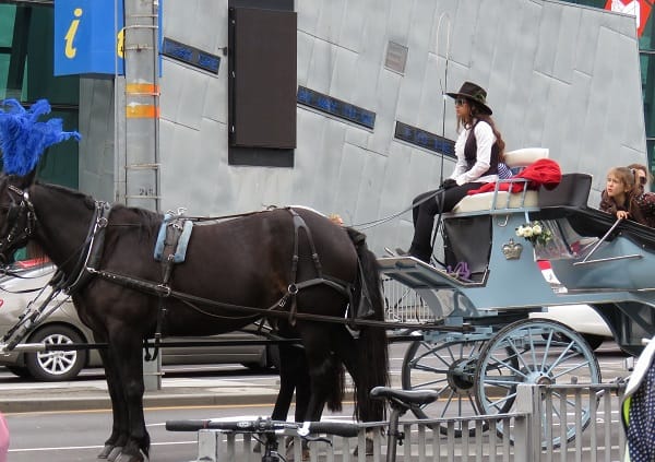 市區電車與馬車都是遊覽墨爾本市區最方便的交通工具,車伕穿著傳統服裝,搭配傳統造型馬車,洋溢古典氛圍,由兩匹馬拉車行駛於專用道,可以坐6至8人,馬匹優雅小跑步,發出輕快的「答答」聲,車行緩慢,讓遊客放鬆心情。