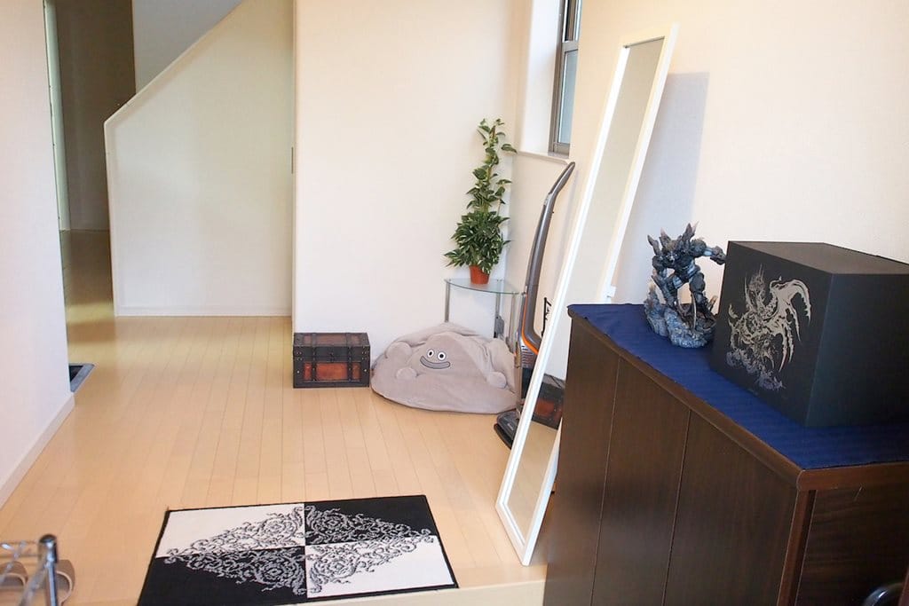 從玄關開始,就可以感受到房子主人Karura對動漫和遊戲的熱愛,史萊姆和勇者的寶箱等ACG相關裝飾一樣不少,還有《FFXI》的勢力旗幟圖案地墊。