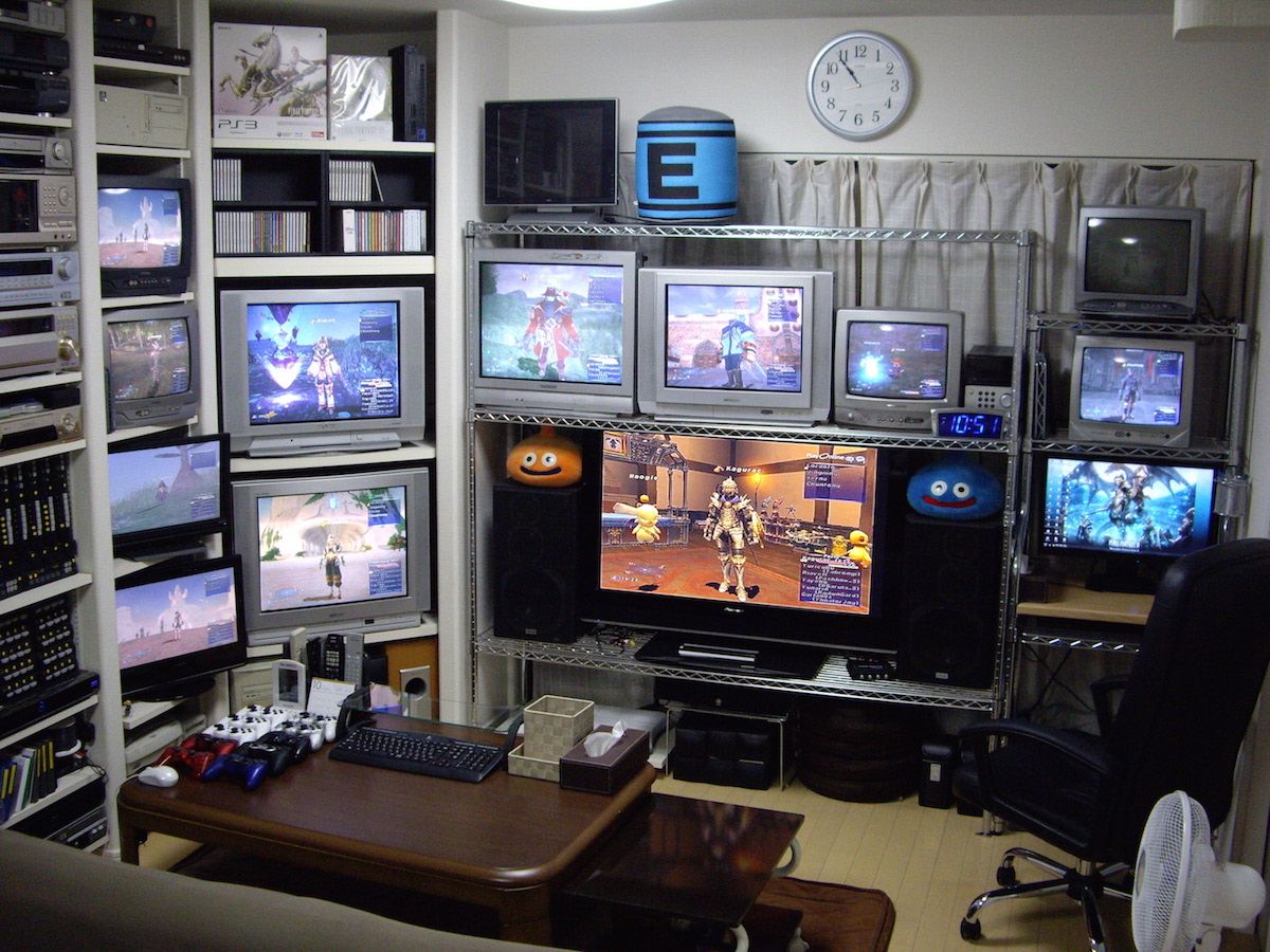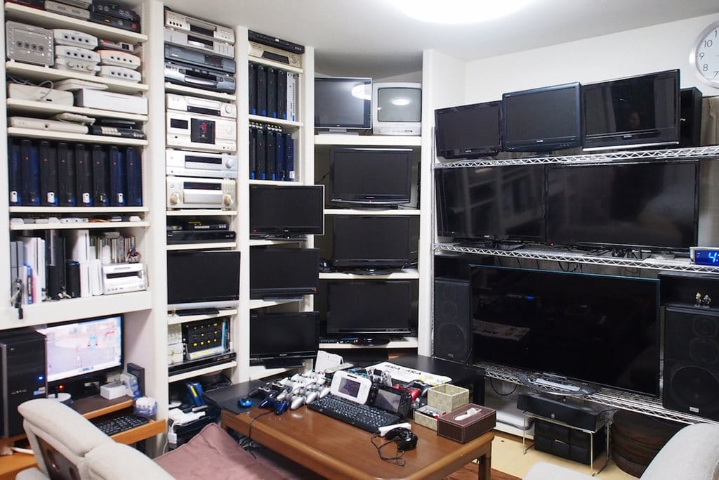 合作夥伴另外除了最新的端子外,傳統的映像管電視和相關備品也都預留了備品,例如現在已經幾乎不再使用的 S 端子就還有上百條的存貨。為了方便管線配置和處理(主機電視螢幕太多了),所以他設計了一個類似車庫一般的自動閘門,直接從遊戲間的主機螢幕群背後打開,方便管理。
