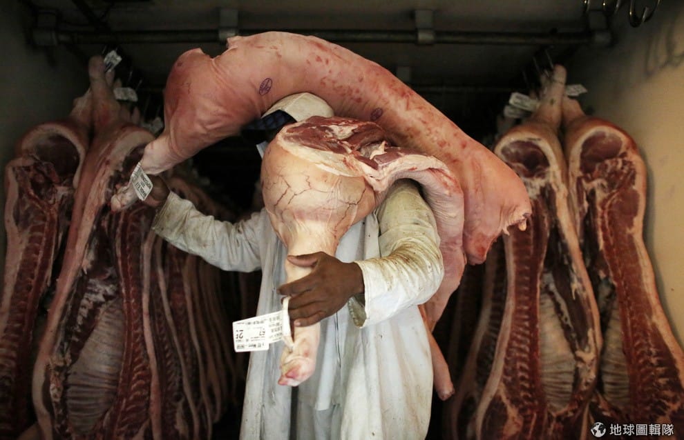 一名員工正在搬運屠宰好的肉品。除了黑心肉問題,檢調單位指出,香腸等絞肉製品也傳出摻雜豬頭的情況。