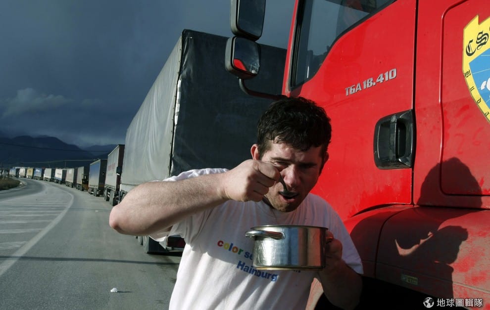 圖拍攝於 2009年,一名司機利用等待穿越邊界的時間吃著午餐。