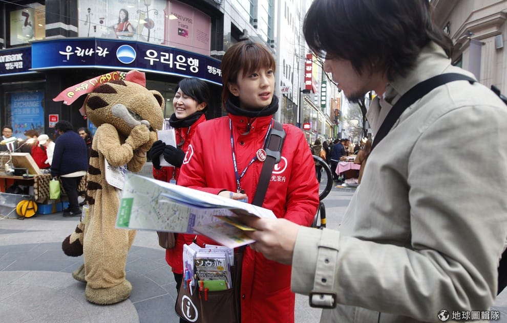 一名日本觀光客在首爾街頭向南韓觀光志工問路。在南韓,人們對行動支付接受度高,無論是在網路或實體店面都喜歡用這類服務。