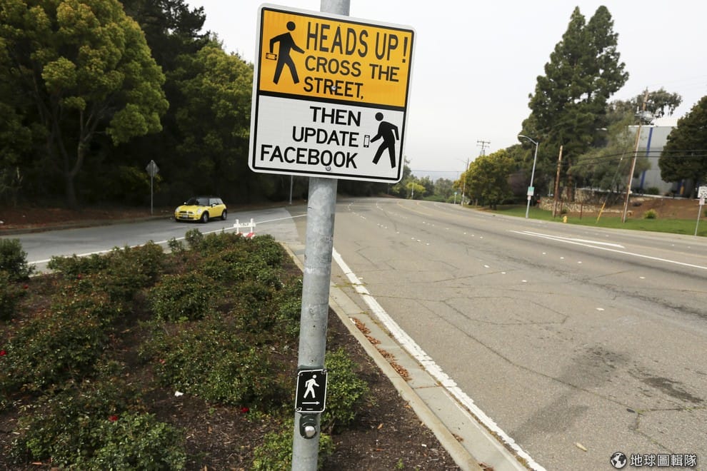 一張告示牌上寫著「抬頭!過馬路」,「然後更新你的臉書動態」。提醒行人們務必要走路看路。