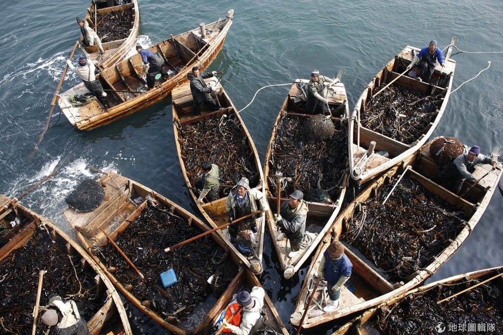 圖為中國漁民,他們一大早出海蒐集到滿船的紫菜。