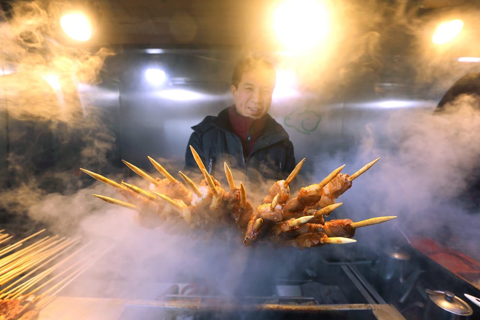 2017年1月19日,一名小販在北京街頭販賣烤雞肉、烏賊和羊肉串。許多黑心食品製造公司瞄準街頭小販,專門以低價賣出會吃出問題的食材給他們。