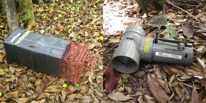捕捉印度小貓鼬的籠式陷阱(左)和筒式陷阱(右)。貓鼬剋星在奄美大島上的貓鼬棲息區內,以50公分間隔線狀設置約3萬個陷阱,每個月全數檢查1次。 取自:環境省奄美野生生物保護中心