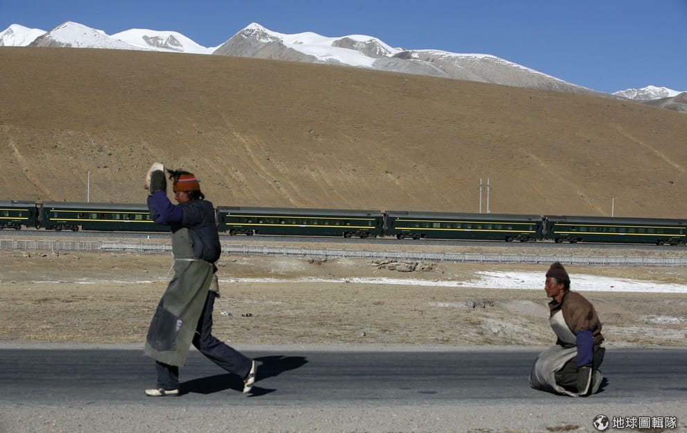 照片中的藏人正虔誠祈福,從他們身邊遠遠望去就是有名的青藏鐵路,這條長達1,956公里的鐵路連接了青海省和西藏自治區,自2006年正式開通後,便捷的交通讓許多觀光客湧入當地。