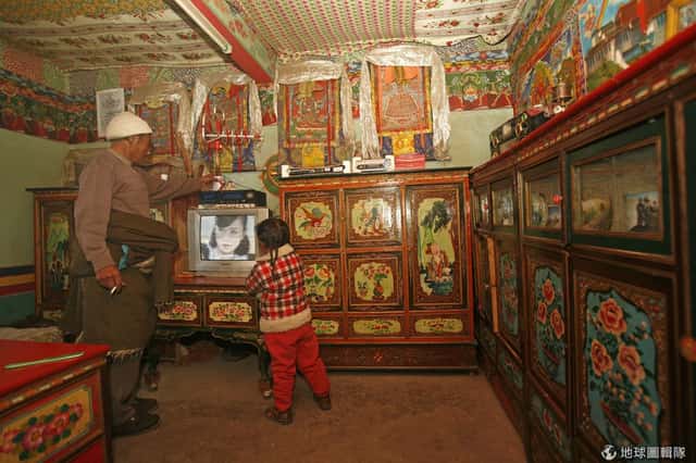 2006年正式開通的青藏鐵路,讓更多觀光客湧入西藏自治區,同時也讓這塊原本看似與世隔絕的土地與外界有越來越多的接觸。照片中是位在青藏鐵路附近的村落,牧人在自家架起了電視機,小妹妹和爺爺一起轉台看電視。