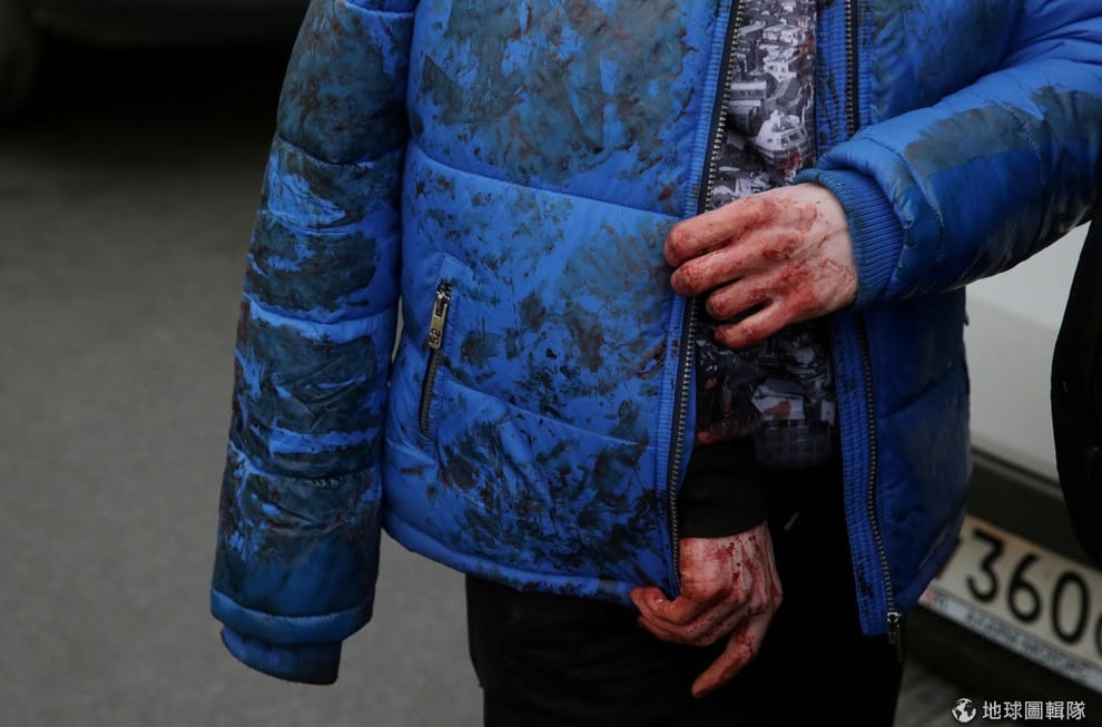 一名流著血的傷患披著外套,走出地鐵站前往醫院治療。