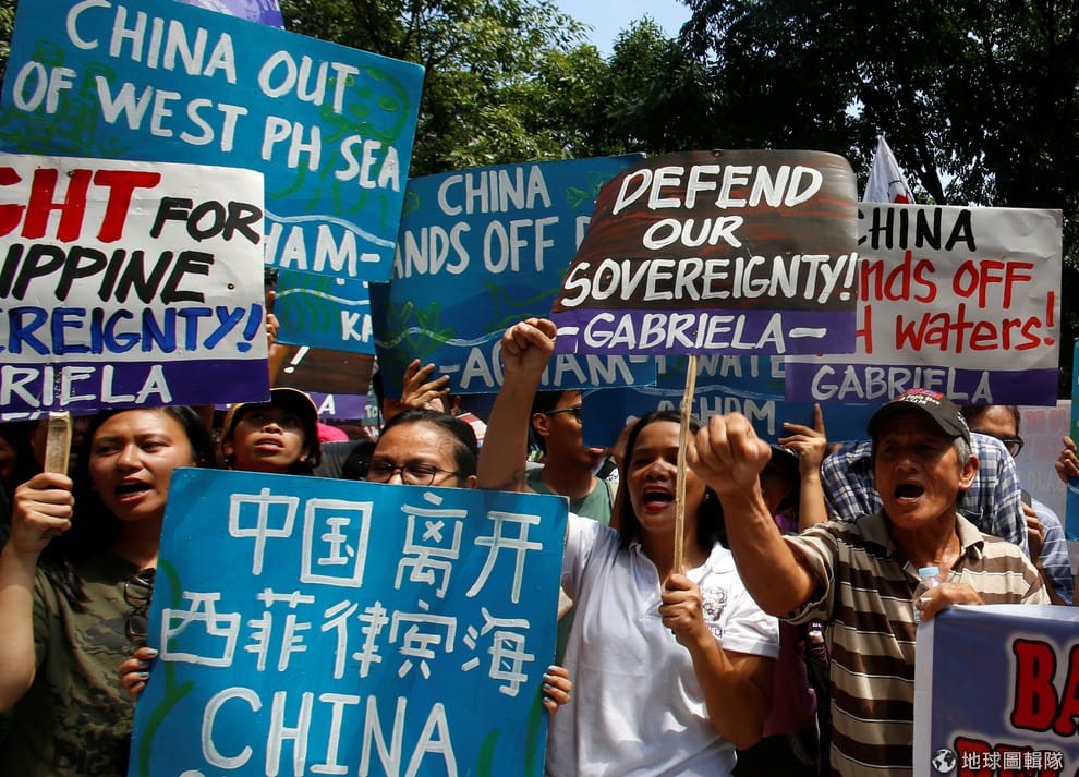 2016年7月,國際法庭裁決中國對南海主權沒有法源依據,菲律賓民眾高舉寫著「捍衛我們的主權」、「中國離開西菲律賓海」的牌子上街抗議中國。