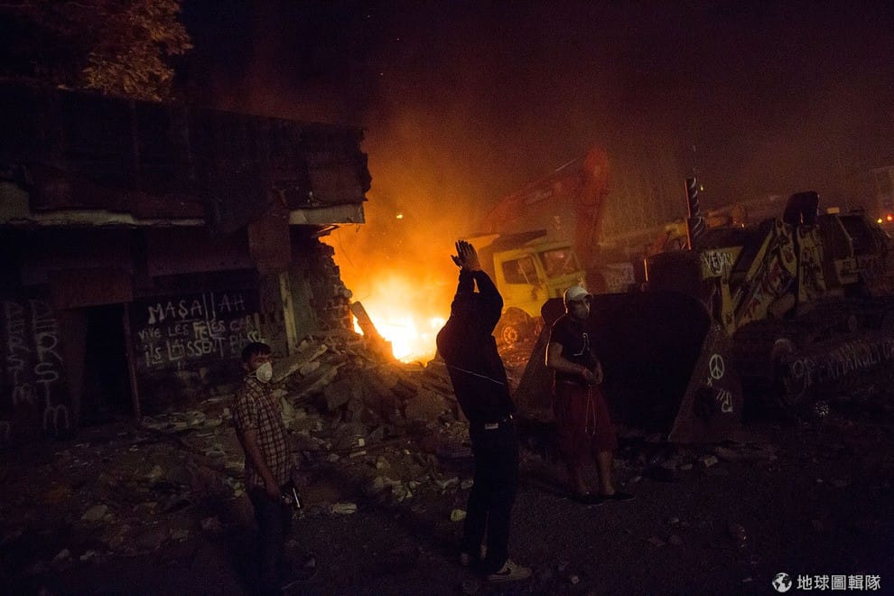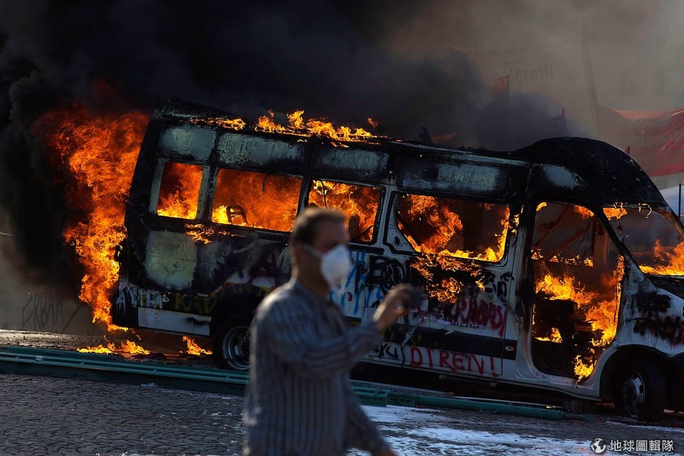 抗議中竄出火焰的車輛開始散出大量濃煙,一旁民眾試圖滅火。