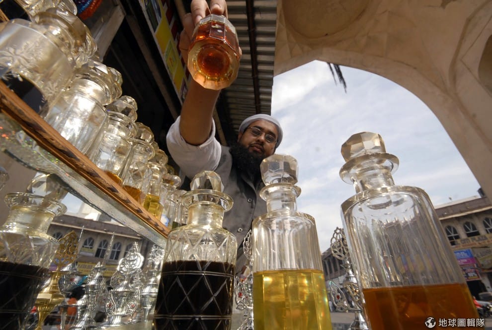 一名小販在街頭上販售著香水。隨著人工合成精油的發展,現在要找到真正用傳統方法提煉出的精油可說越來越不容易,但並不代表這項技藝已經消失。