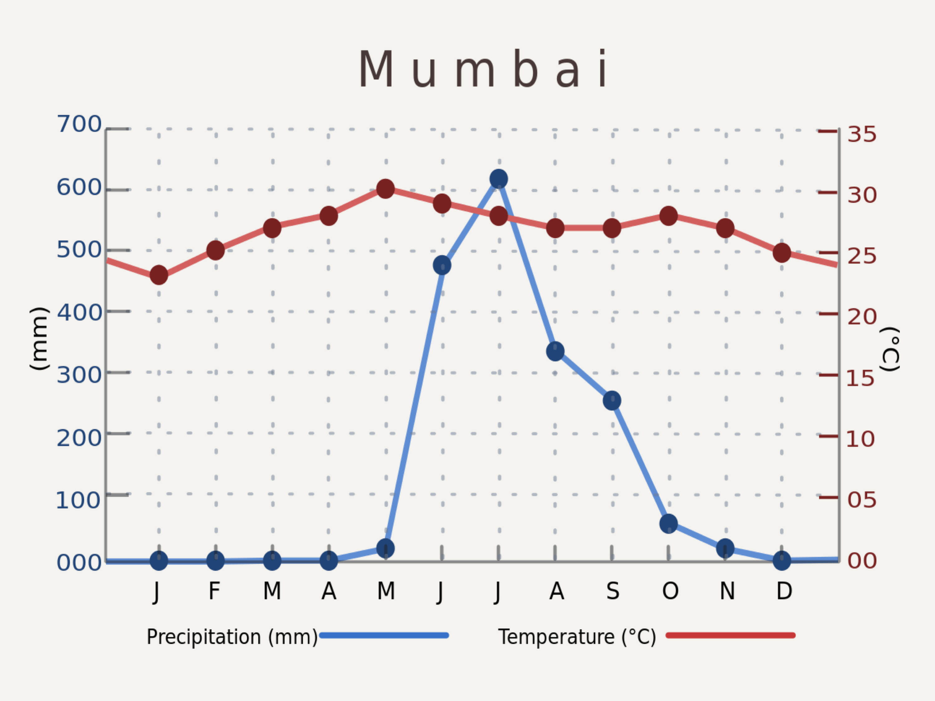 圖為孟買的各月降雨量與氣溫。一般來說,印度在 3-5月是最炎熱乾燥的熱季,6-10月則是雨季,11-2月則是涼季。受到地形影響,各地的時節又略有不同。
