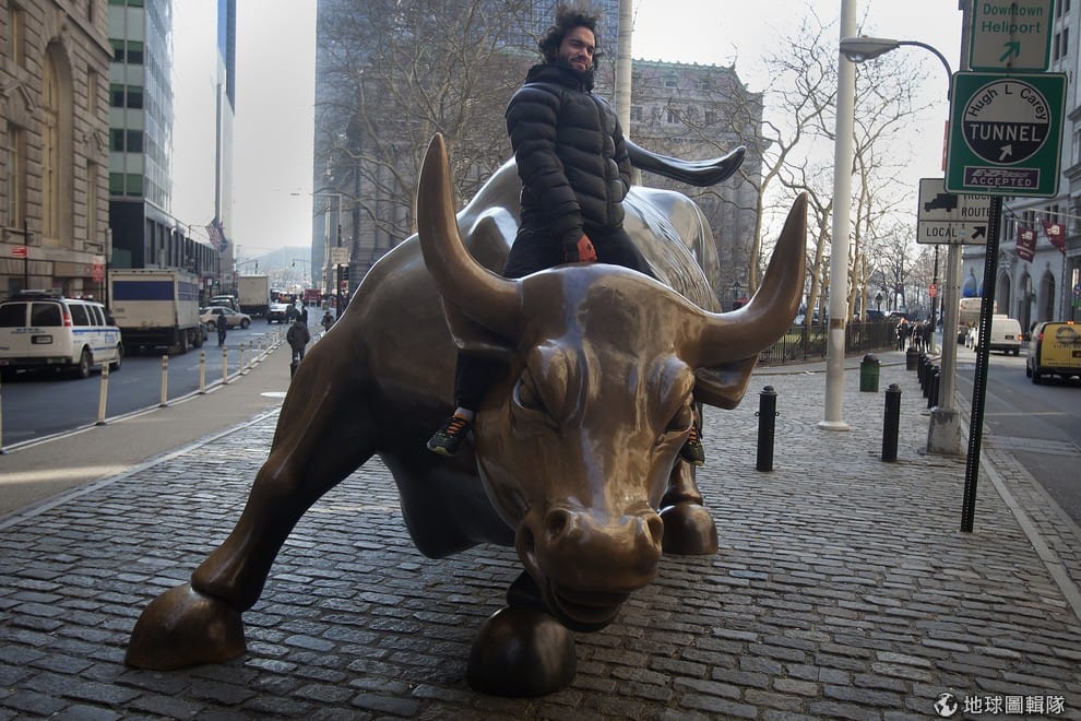 一名觀光客坐在「華爾街銅牛」上。這尊銅牛長 4.9公尺,高 3.4公尺,是在 1989年由狄莫迪卡偷偷豎立在華爾街,雖然一開始立刻被拆除,卻在人們的抗議中被保存下來。時至今日,銅牛也成為了華爾街的象徵,但也免不了讓它成為抗議華爾街的象徵物。