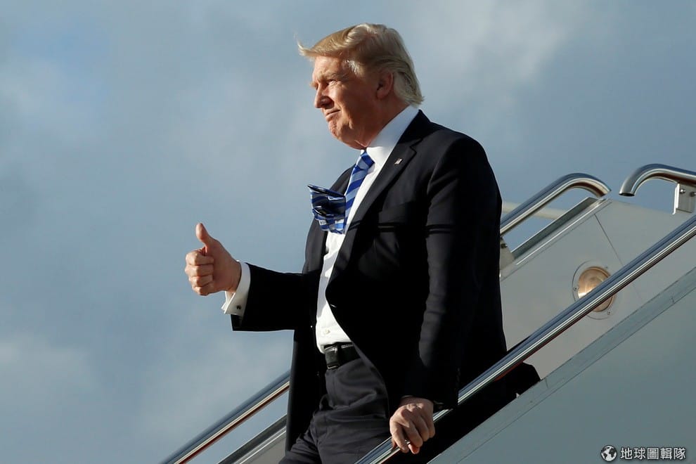13號這天,美國總統川普搭機降落在佛羅里達州,他手比大拇指和接機的媒體示意。